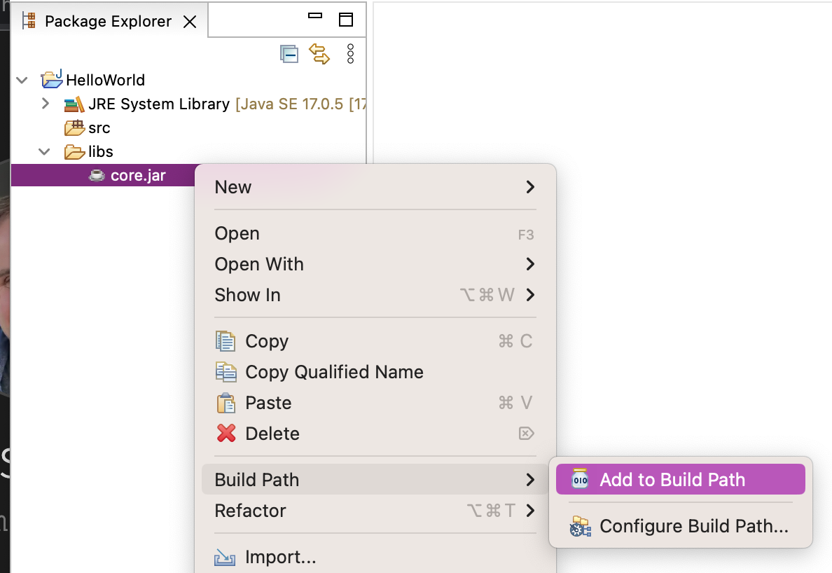 - Right click on core.jar. Choose Build Path -> Add to Build Path. Adding to build path