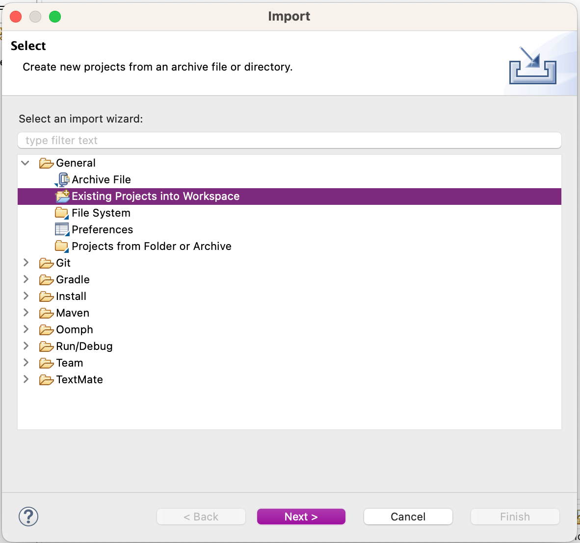 - Choose General -> Existing Projects into Workspace. Eclipse Import dialog